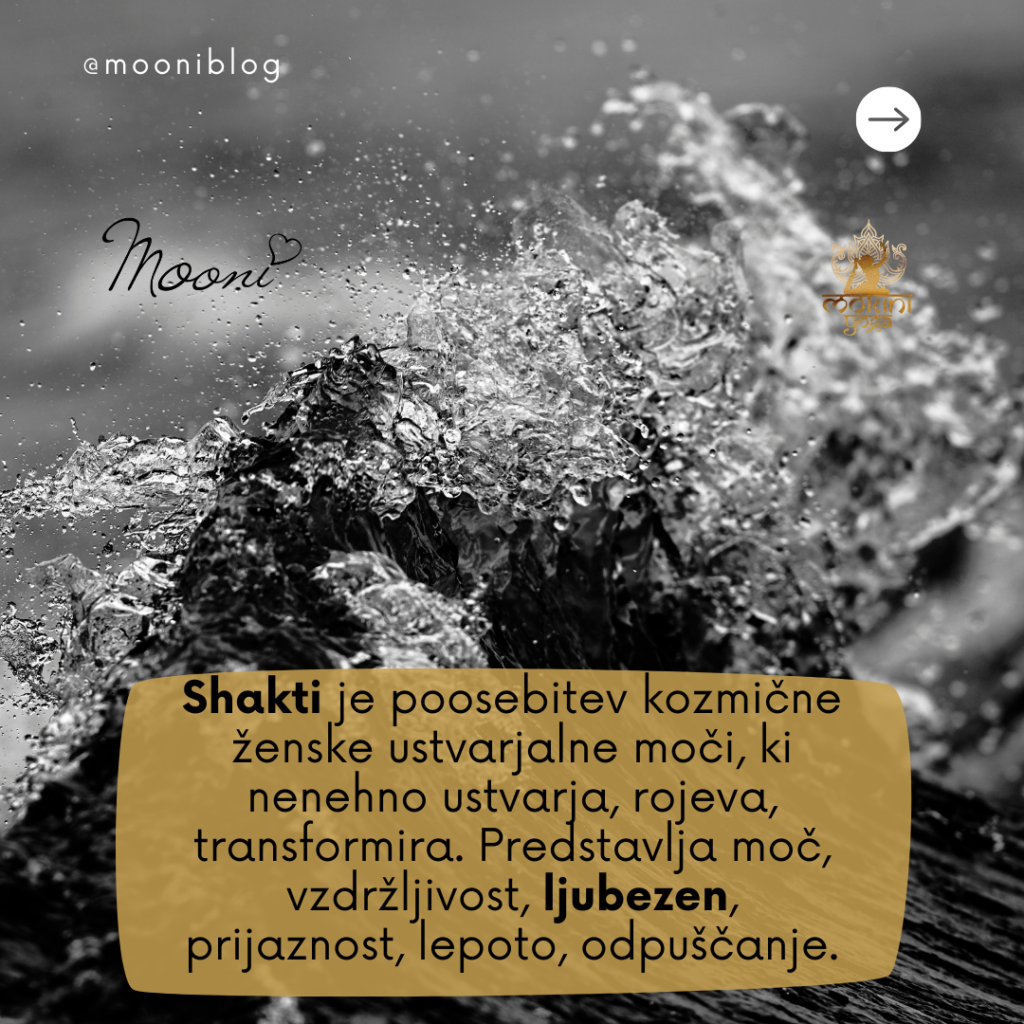Shakti je poosebitev kozmične ženske ustvarjalne moči, ki nenehno ustvarja, rojeva, transformira. Predstavlja moč, vzdržljivost, ljubezen, prijaznost, lepoto, odpuščanje.