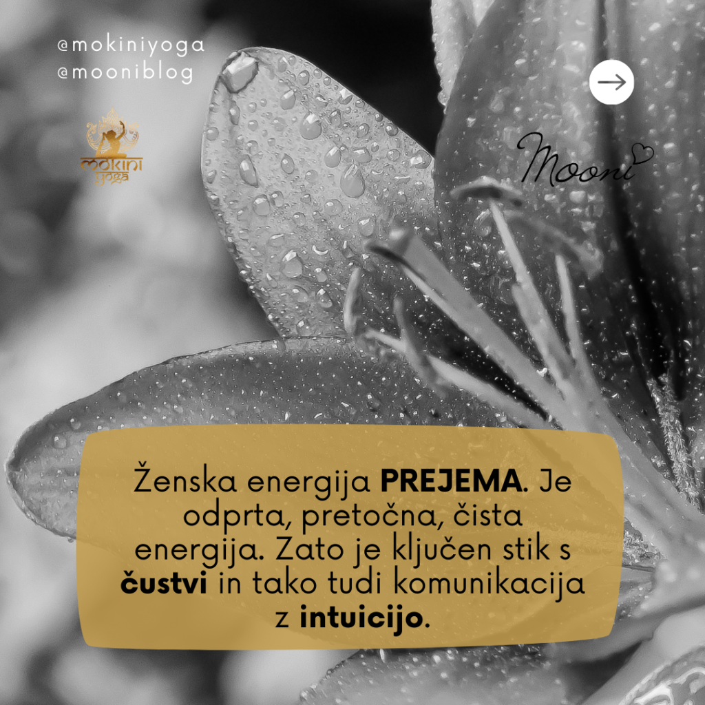 Ženska energija PREJEMA. Je odprta, pretočna, čista energija. Zato je ključen stik s čustvi in tako tudi komunikacija z intuicijo.