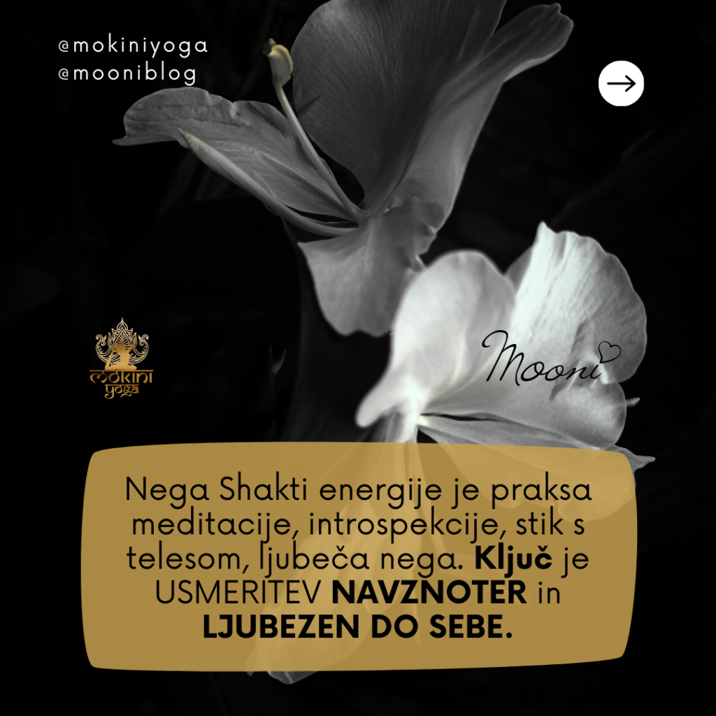 Nega Shakti energije je praksa meditacije, introspekcije, stik s telesom, ljubeča nega. Ključ je USMERITEV NAVZNOTER in LJUBEZEN DO SEBE.