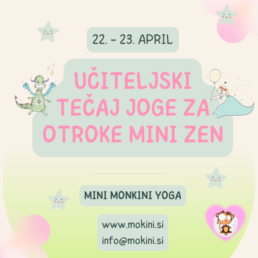 Učiteljski tečaj joge za otroke Mini zen, ki se odvija 22. – 23. aprila in Delavnica: Tehnike za podporo pri tesnobi otrok, ki se odvija 29. aprila.