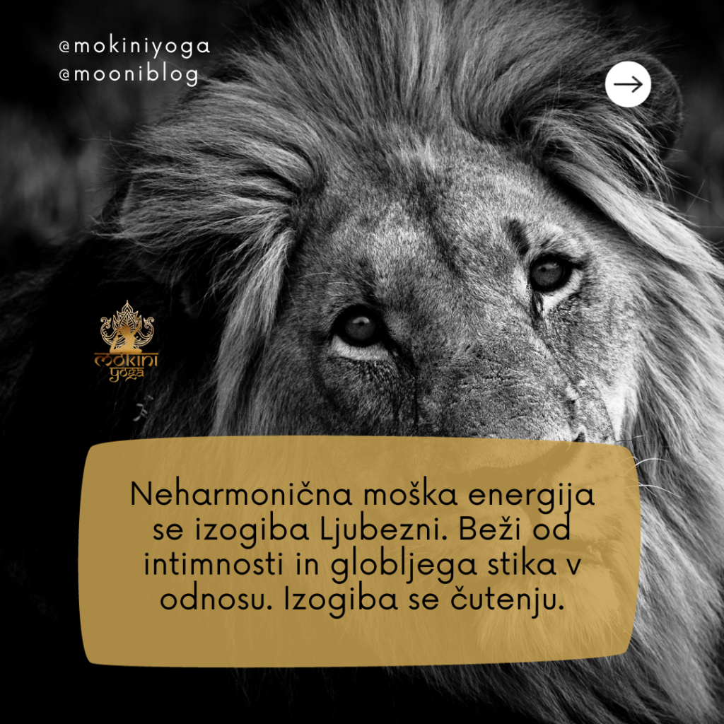 Neharmonična moška energija beži od Ljubezni in intimnega odnosa. Ko se partnerka približa, se prestraši in zbeži stran. Raje se zamoti z delom in odnosi, ki so plitki in ni globokih čustev. Izogiba se torej čutenju, saj to predstavlja ranljivost, občutek, da izgublja sebe, samostojnost.