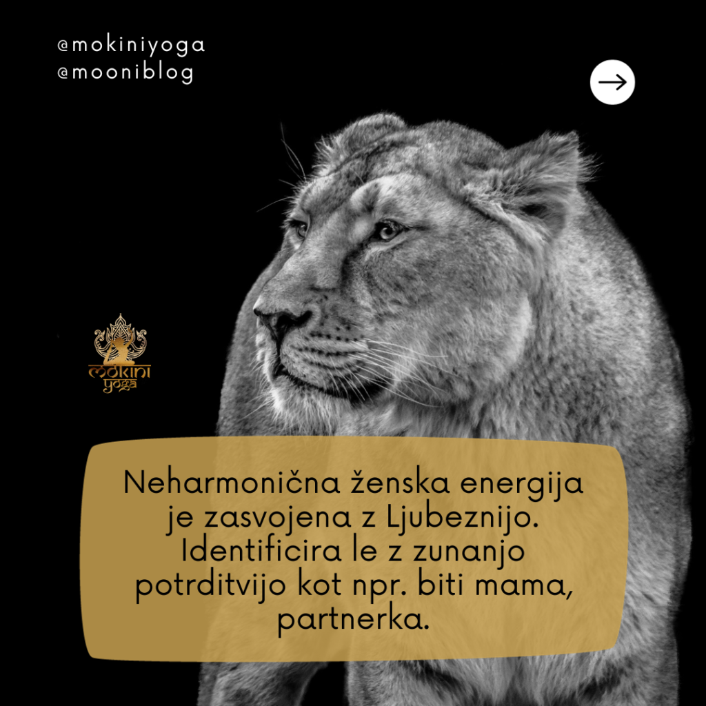 Neharmonična ženska energija je zasvojena z Ljubeznijo. To daje na prvo mesto v svojem življenju in tako hrepeni po zunanji potrditvi. Zato je lahko velikokrat v odnosu preveč zahtevna, izredno čustvena in se oprijema partnerja. Ne najde sreče izven partnerskega odnosa ali na primer vloge mame. Moškega želi nadzirati in mu odvzema svobodo.