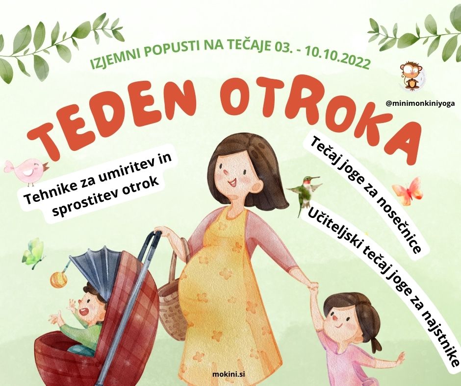 Praksa joge, ki prinaša mir, moč in harmonijo na poti nosečnosti. Jogijski položaji in praksa pa je prilagojena različnim obdobjem med nosečnostjo. Naj bodo jogijske tehnike čudovit pripomoček in podpora za vaše dobro fizično počutje, mentalni mir, čustveno podporo, poglobljen dih in soočenje z različnimi spremembami, ki ga prinaša to obdobje. Povežite se s seboj in in s srcem, ki utripa v vas. Pri vpisu napišite kodo mami50 in pridobite 50% popust. Popust velja s plačilom do 10.10.2022. Popusti se ne seštevajo. Več informacij kliknite TUKAJ.
