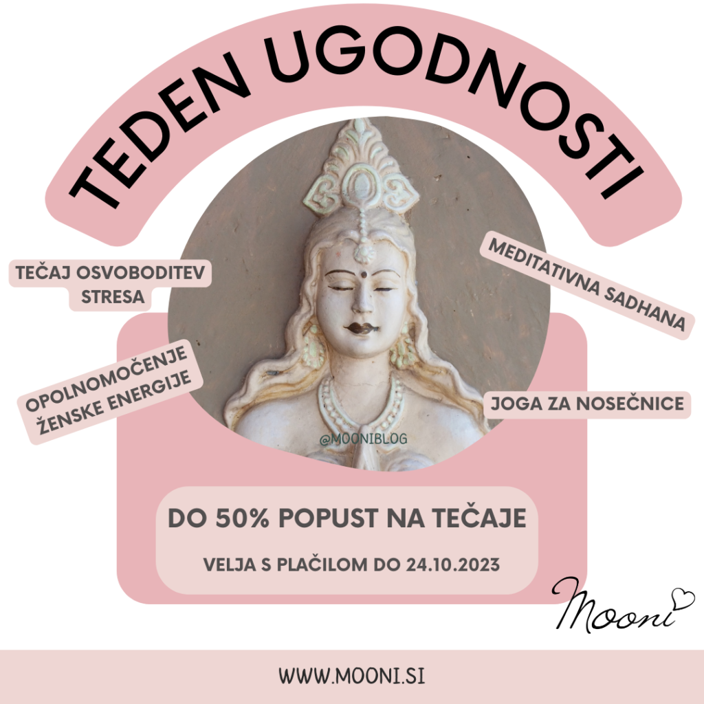 TEČAJ MEDITACIJE – MEDITATIVNA SADHANA; to je 12 – tedenski tečaj in je namenjen vsem. Sedaj je na voljo s 30% popustom. Cena je tako 56€. Več o tečaju TUKAJ.